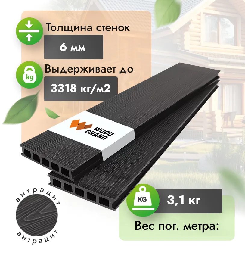 Наша террасная доска из ДПК выдерживает до 3318 кг/м2, влагостойкая, не требует ухода.